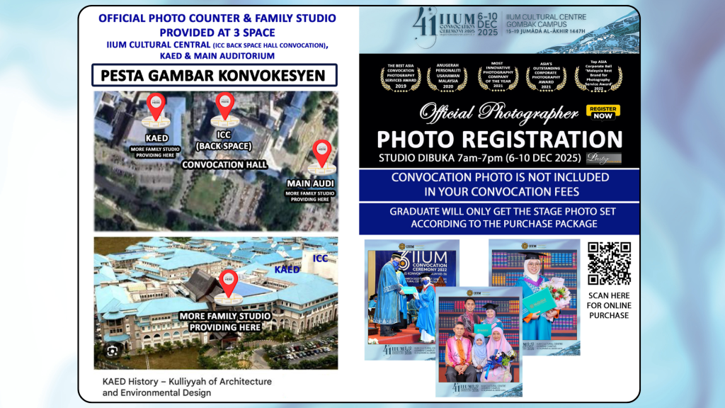 Convocation ceremony is definitely a prestigious event to graduands. It is customary for graduands to have photos of them receiving their scrolls a keepsakes to be cherished. IIUM therefor has appointed photographic studios to provide services to graduands during the every ceremony. During the 41st Convocation the honour is given to Prestige Media Studio Sdn Bhd  to capture your moments on stage. Be sure you are glitter ready!